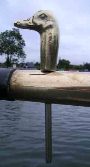 There’s only one confusing thing - there used to be 9 locks which were rebuilt into 8 and there’s a pub called “The Tenth Lock” at the bottom! BW do try to make you “do it right” as there are only short pounds between the locks - paddles are painted blue (at the bottom end) and red (at the top): you’re instructed to always open the paddles to fill the lock downhill of you before descending the upper lock, so the water you let out fills the pound instead of going over the weir. I don’t know what happens if the locks are already full............. having done the eight single-handed (and they were all against us) we happened upon a local “character” at the bottom. John is known to all the locals and spends his summer helping boaters up and down the Stourbridge flight. He helped us as far down the flight as we wanted to go (12 out of the 16), running hither and yon like a mad thing, setting paddles and opening gates - all for fun. We eventually moored up opposite the Glass Cone - not without incident. I had got the mooring stakes out (haven’t used them in years) and had tied up when a boat went down the flight. It dropped the water level somewhat (or threw us up on the bank) with the result that Tam Lin took on a list. Prodding with the boat hook revealed a lump of stone sticking out of the towpath wall. A quick burst us in reverse slid us off the stone and all was well. We wandered up into Worsley, got some fish and chips and visited a local pub for a pint before wondering back to the boat. Digi TV - zilch analogue BBC only. Tiller Pin of the Day - Duck’s Head.